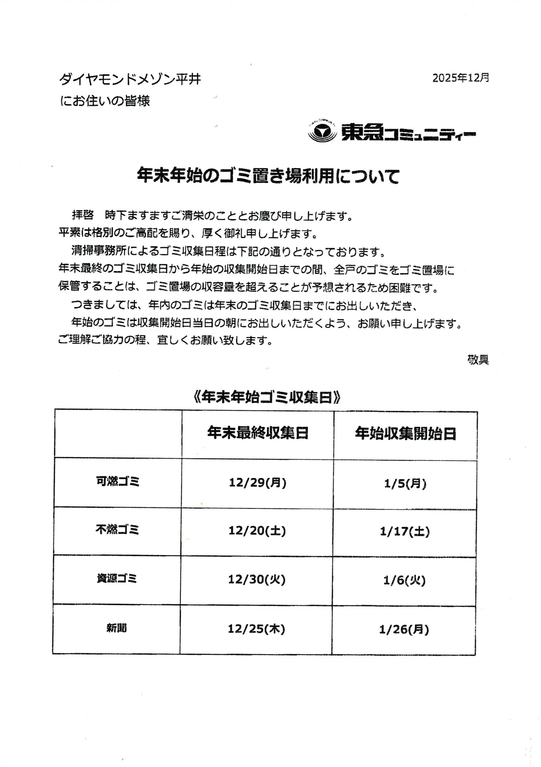 2025年12月1日 / 最終更新日 : 2025年12月2日 kanrihirai2157 未分類 年末年始ゴミ置き場利用について コメントを残す コメントをキャンセルメールアドレスが公開されることはありません。 ※ が付いている欄は必須項目ですコメント ※ 名前 ※ メール ※ サイト 上に表示された文字を入力してください。