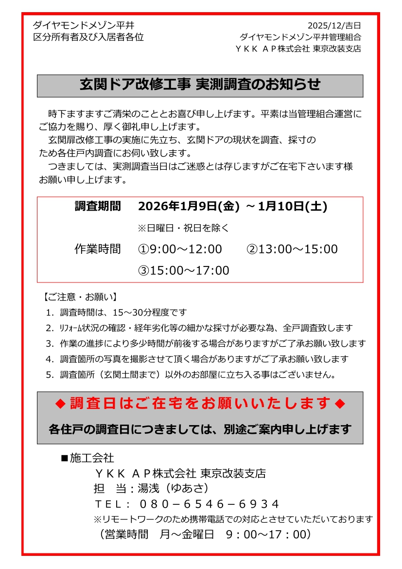 2025年12月2日 / 最終更新日 : 2025年12月2日 kanrihirai2157 未分類 玄関ドア改修工事 実測調査のお知らせ コメントを残す コメントをキャンセルメールアドレスが公開されることはありません。 ※ が付いている欄は必須項目ですコメント ※ 名前 ※ メール ※ サイト 上に表示された文字を入力してください。
